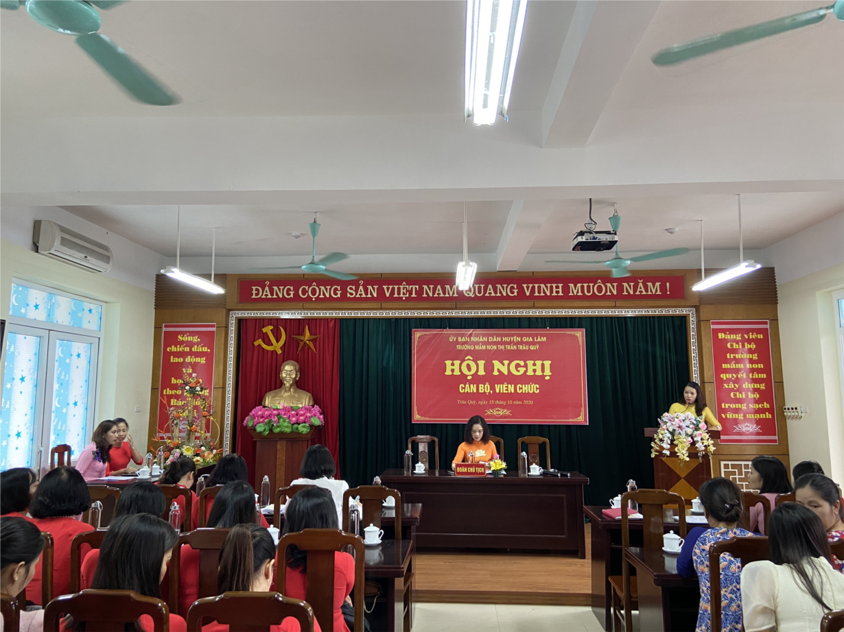 Với tinh thần dân chủ, tinh thần trách nhiệm, Hội nghị đã tiến hành thảo luận, đóng góp xây dựng hoàn thiện Chỉ tiêu nhiệm vụ năm học 2020 - 2021. Đặc biệt Hội nghị tập trung thảo luận vào các vấn đề nhiệm vụ trọng tâm năm học, các chỉ tiêu, giải pháp nhằm nâng cao chất lượng trong công tác quản lý, nâng cao chất lượng chuyên môn, đổi mới phương pháp dạy học ứng dụng phương pháp giáo dục tiến tiến Steam vào trong hoạt động dạy học, Thực hiện tốt chuyên đề " Xây dựng trường lớp mầm non hạnh phúc,Nâng cao chất lượng bữa ăn đảm bảo VSATTP nhất là trong mùa dịch; bên cạnh đó còn có ý kiến đóng góp rất quý báu tham mưu thúc đẩy các hoạt động phong trào thi đua của nhà trường, phát triển đảng viên trong chi bộ để cùng đưa mọi hoạt động ngày càng lớn mạnh.